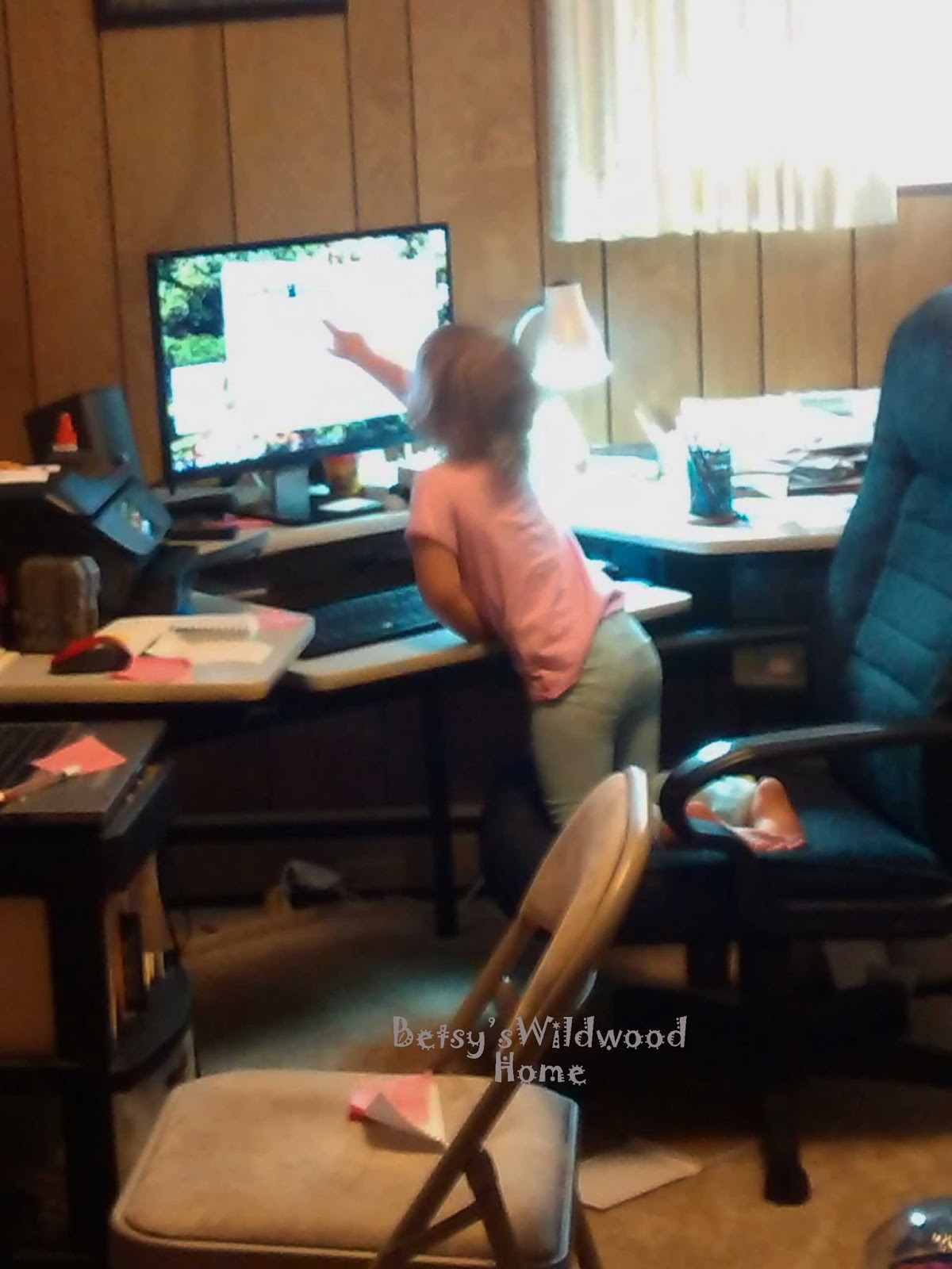 While Adalyn was busy, Genevieve was busy in the office at Opa's work area.